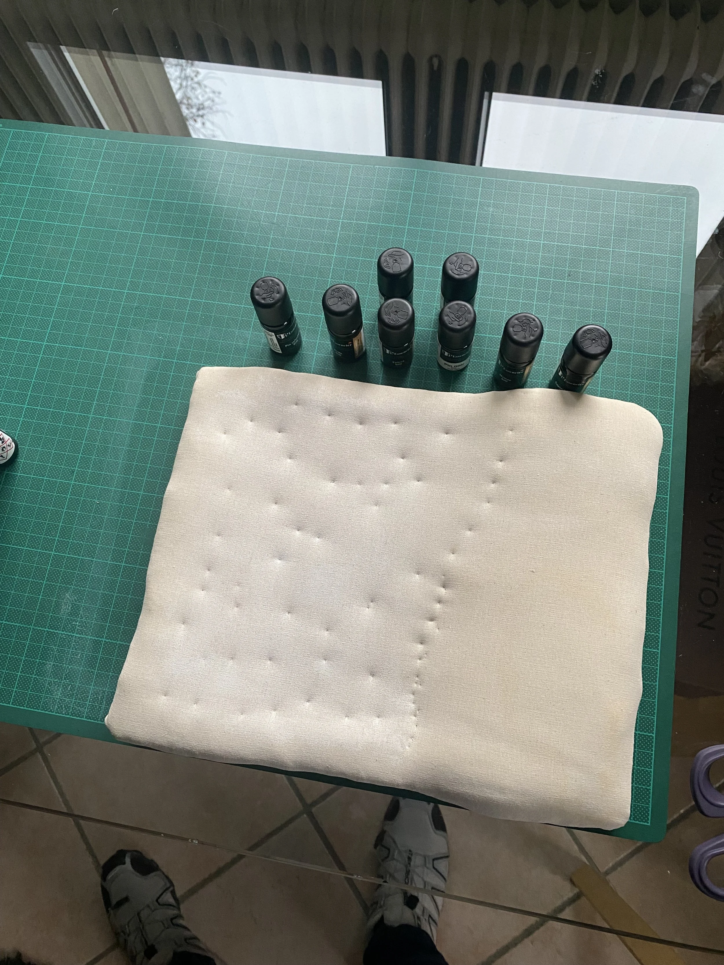minimalist textile study and conifer essential oil bottles